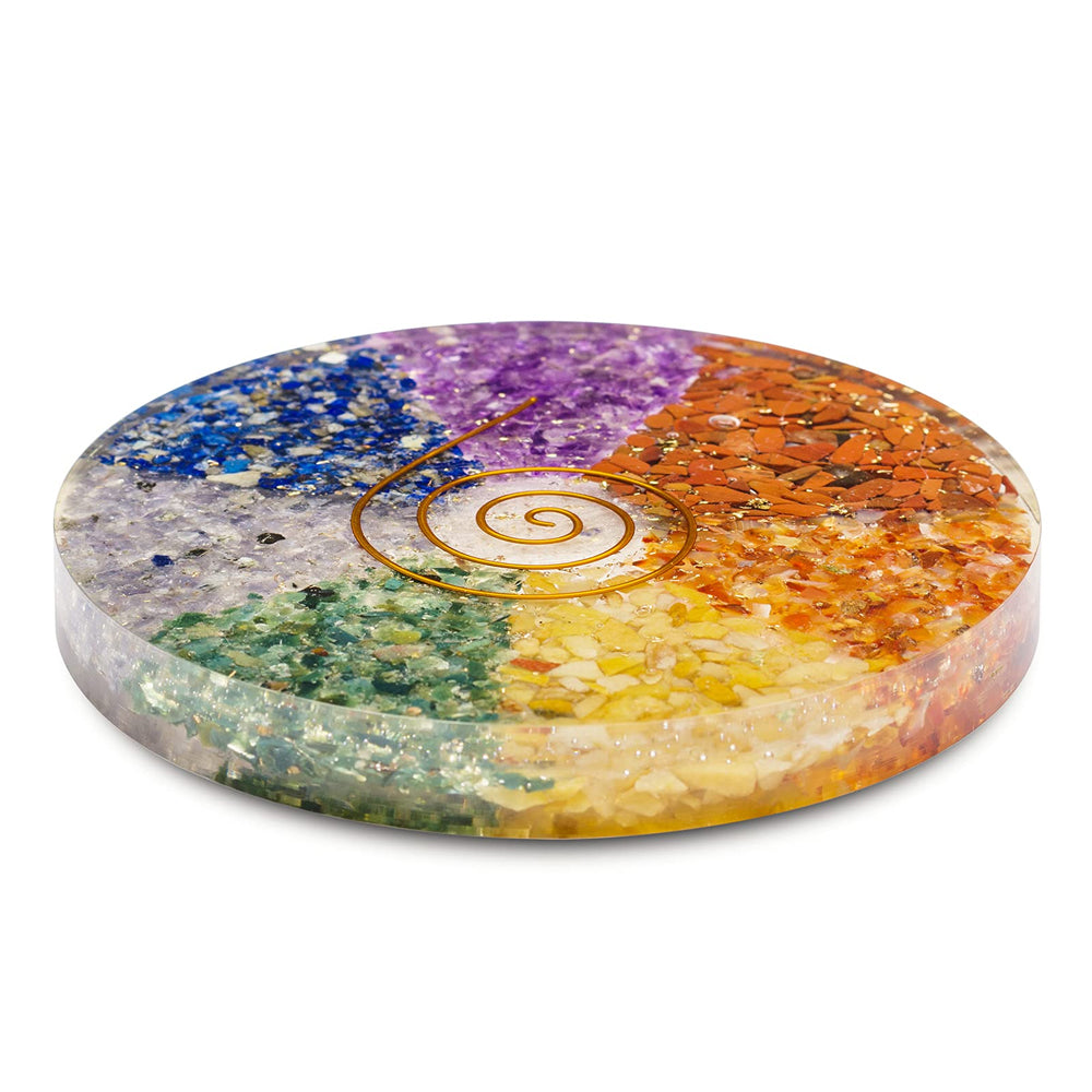 7 Chakra Orgone Coaster helps to filter and balance energy fields in our environment and can aid in strengthening your energy body by converting low-frequency energy into a higher frequency that is more beneficial for life forms including yourself, pets, and plants.