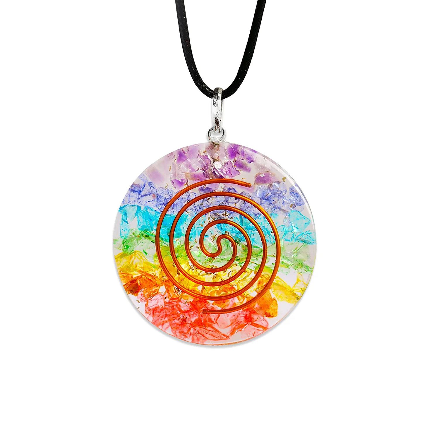 7 Chakra Orgone Pendants round with copper coil help to filter and balance energy fields in our environment and can aid in strengthening your energy body by converting low-frequency energy into a higher frequency that is more beneficial for life forms including yourself, pets, and plants.