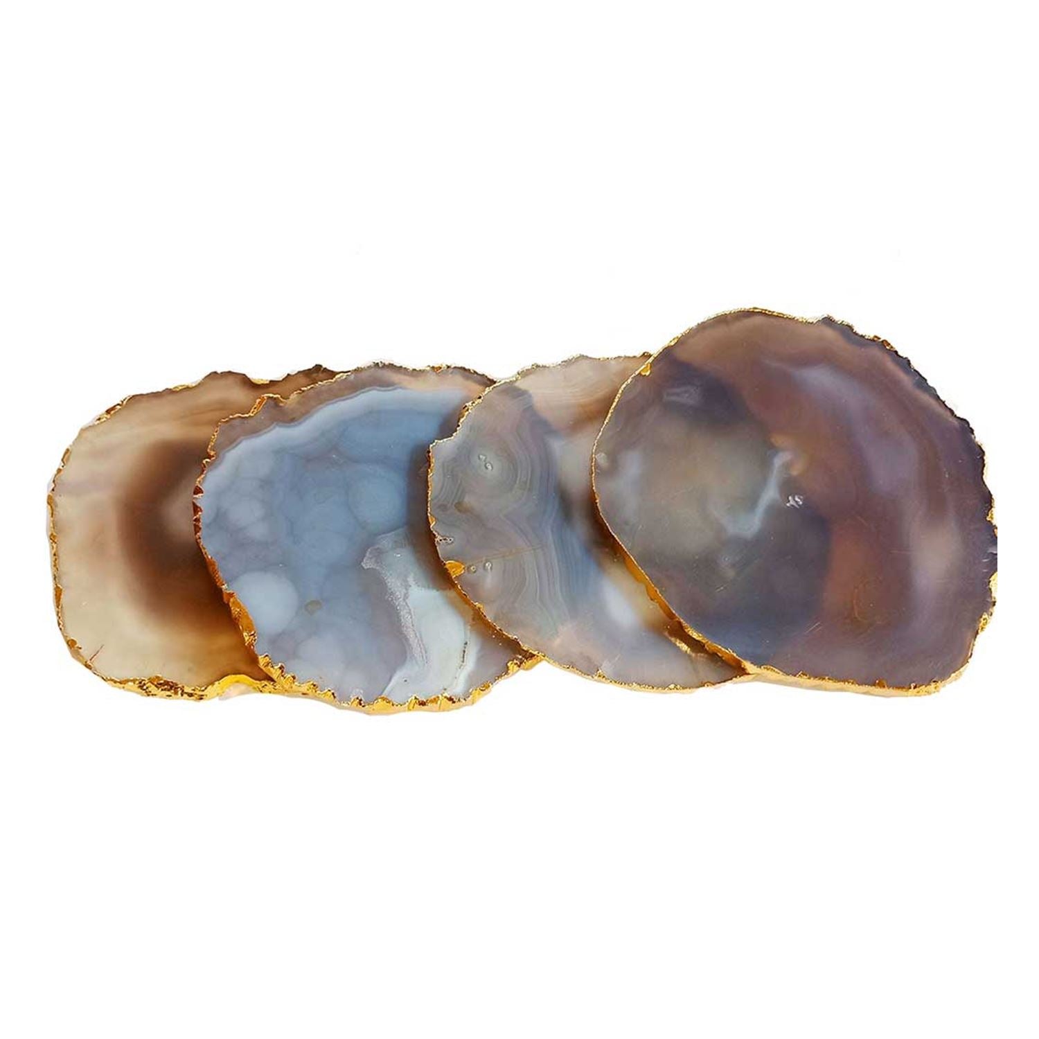 Grey Agate Crystal Coasters are a set of coasters made from grey agate stone, used to place drinks on to protect surfaces from stains or scratches. They often have a decorative purpose as well and are considered an elegant addition to any table setting.