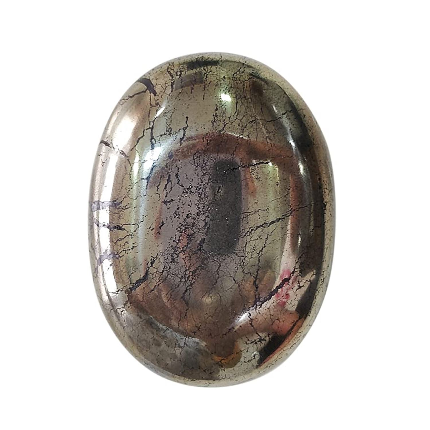 A Pyrite Crystal Palm Stone is a small, smooth, polished gemstone that can be held in the palm of the hand. Pyrite is a mineral of the feldspar group and is known for its iridescent play of colors, called arborescence.