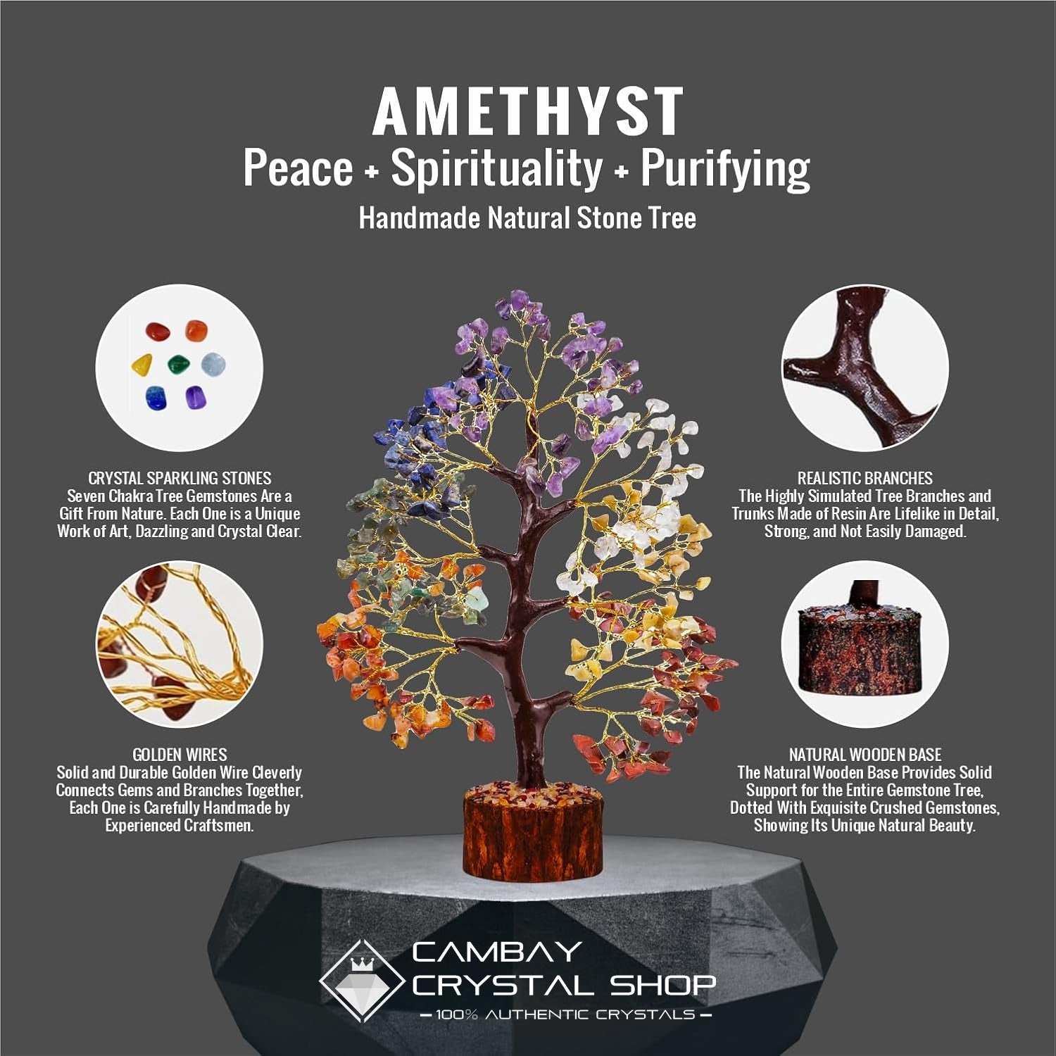 The tree features a natural wooden base and trunks made from durable resin, providing stability while adding a touch of elegance. Each crystal branch is securely connected using gold-colored wires, adding a touch of luxury to this unique piece. Whether you're looking to add a spiritual element to your decor or gift a loved one, this Seven Chakra Tree is a perfect choice.
