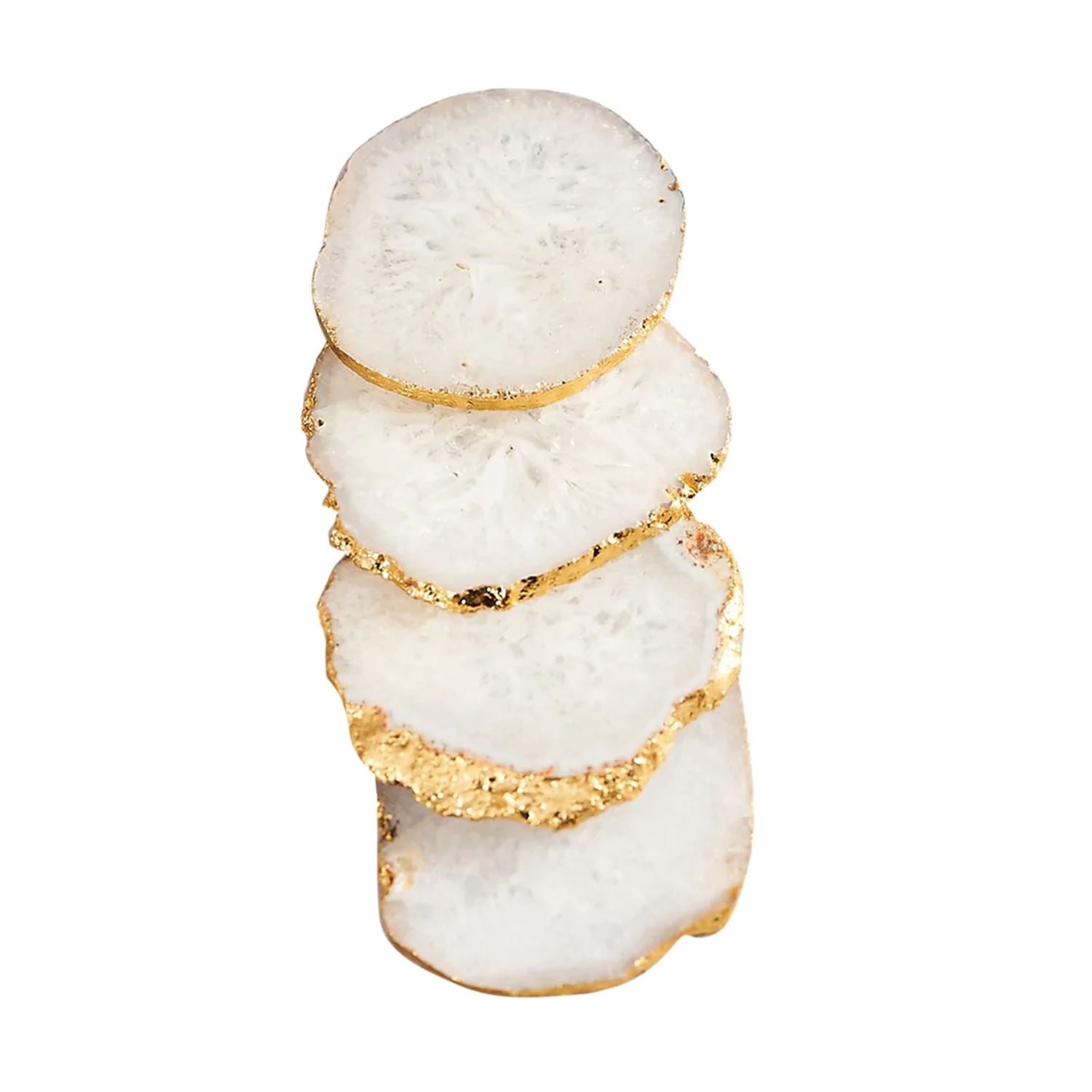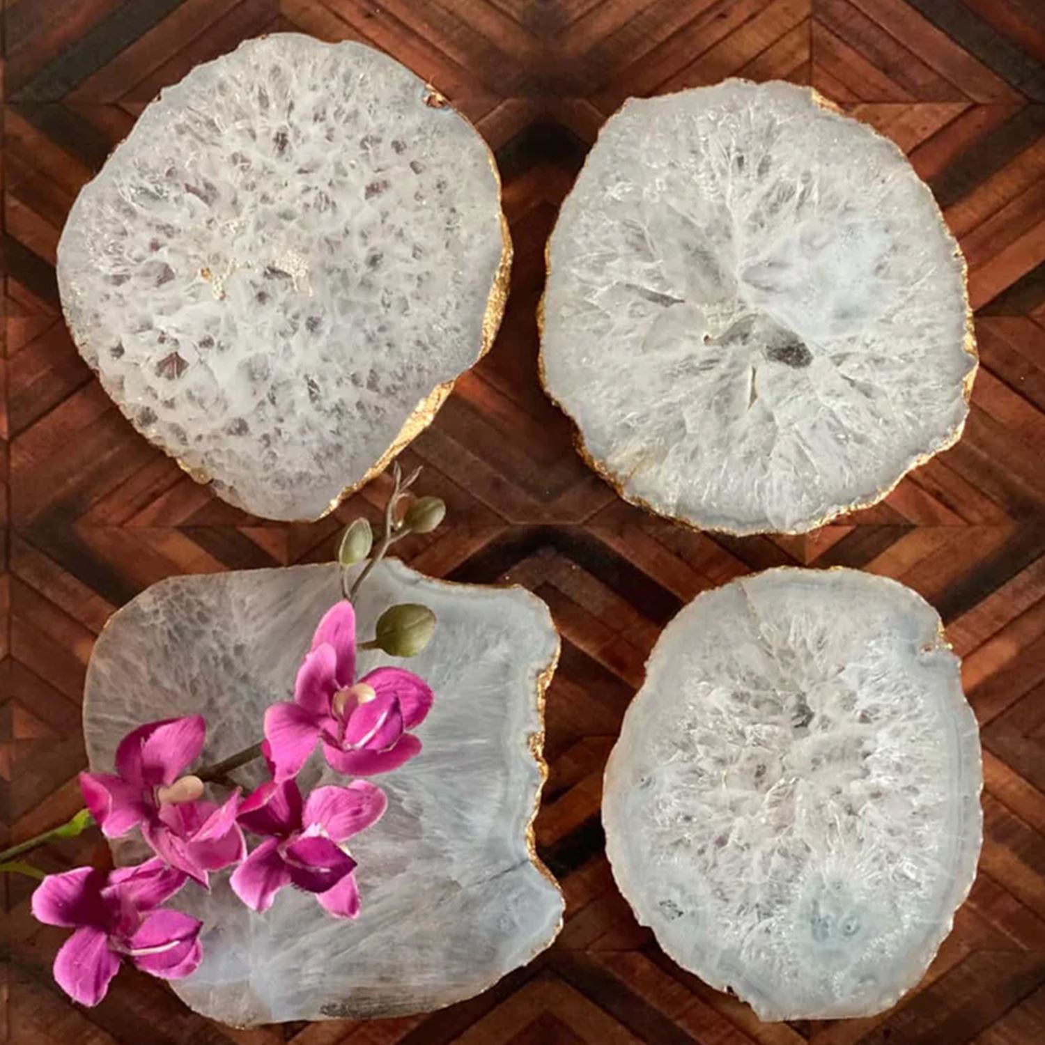 White Agate Crystal Coasters are a set of coasters made from white agate stone, used to place drinks on to protect surfaces from stains or scratches. They often have a decorative purpose as well and are considered an elegant addition to any table setting.